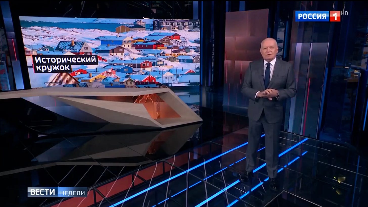 But on the other hand, Russian media were also instructed to portray the American plans as being analogous to Russia’s 2014 annexation of Crimea. Trump supposedly was keen to “enter history like Putin” by expanding the U.S.’ national territory, behaviour that was to be framed as being "characteristic of great powers". Maksim Suchkov, director of MGIMO’s Institute of International Studies, told Kommersant’ that Trump was bent on an “annexation of the world’s largest island” for legacy reasons. And Sergey Lavrov managed to refer to the Greenland situation both as an example of “colonialism” while also likening it openly to Crimea.